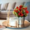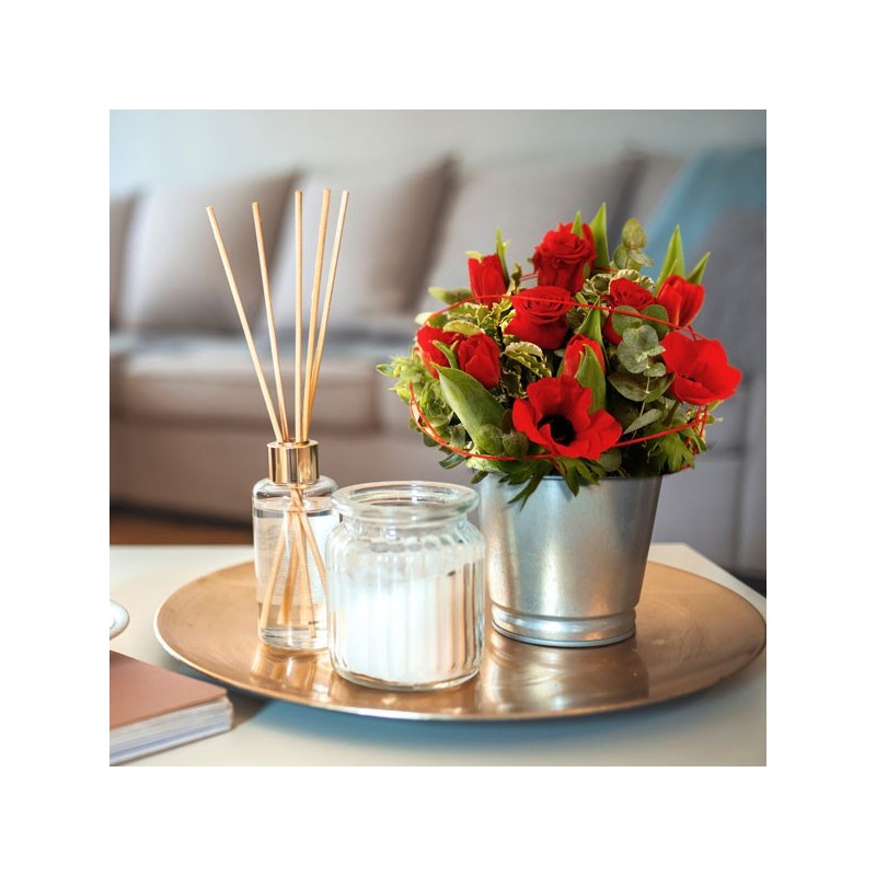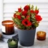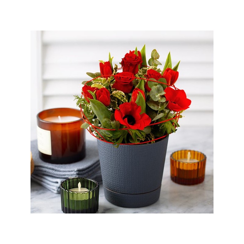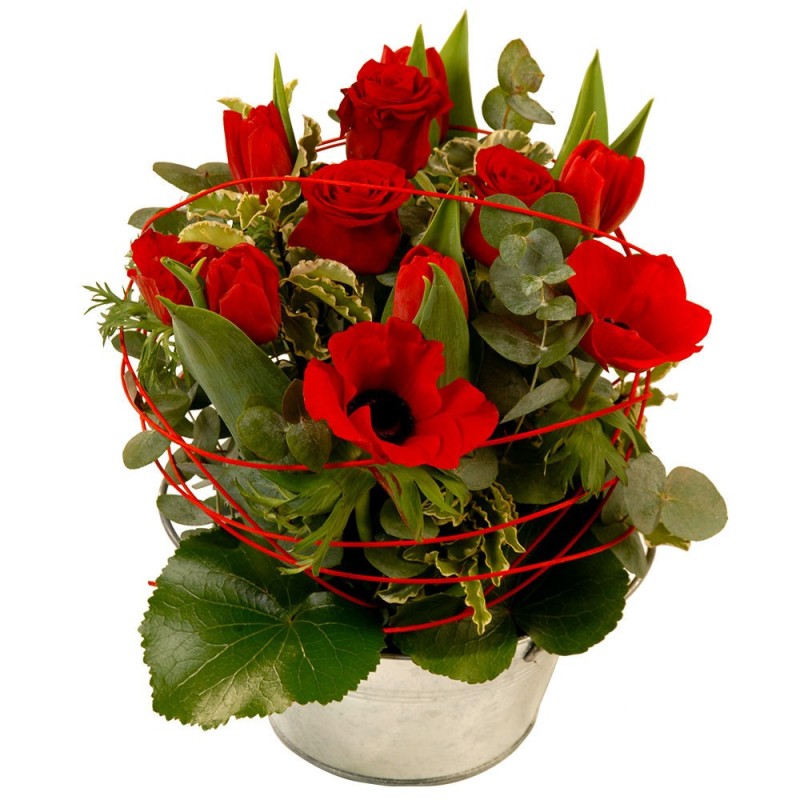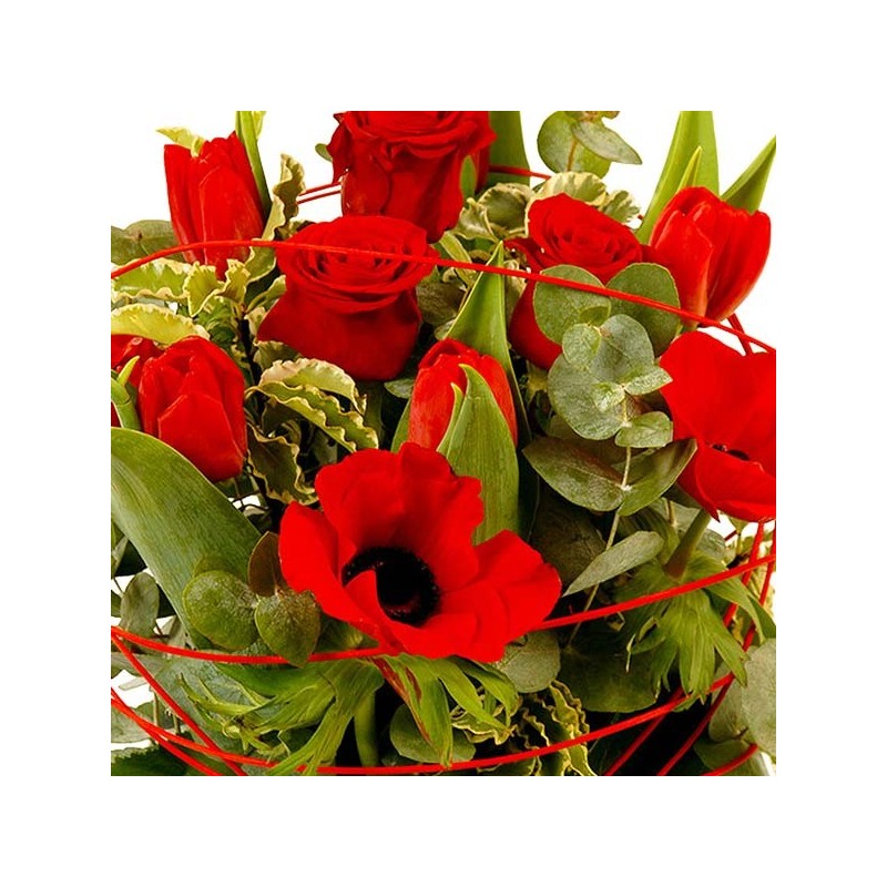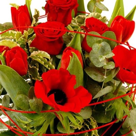 Composition piquée dans les tons rouges, composée de tulipes, roses et fleurs de saison, accompagnées de feuillages dans un contenant rond (le contenant peut varier en fonction de l'arrivage du fleuriste).