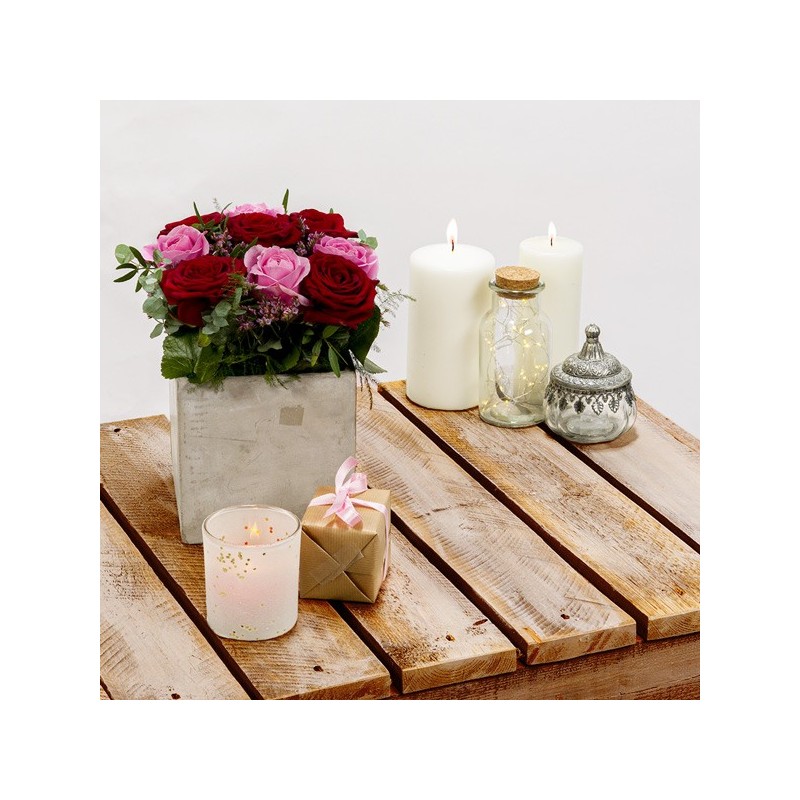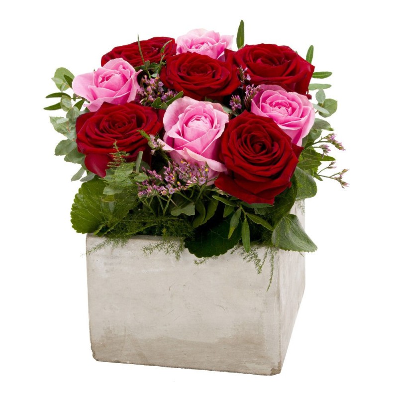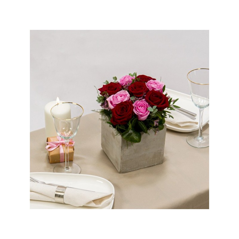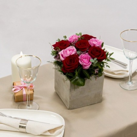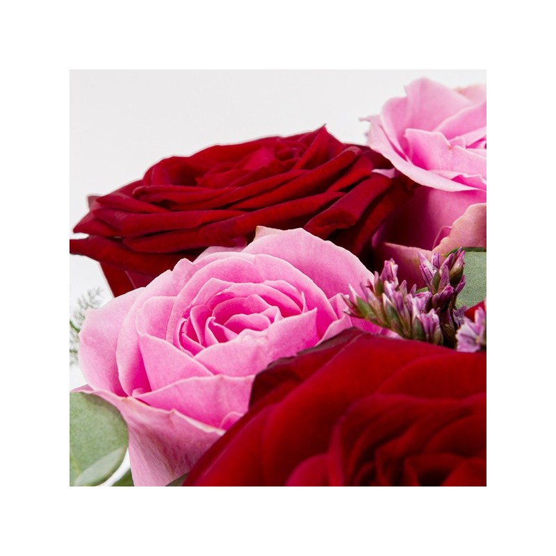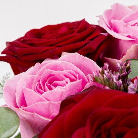 Composition piquée dans les tons rouge et rose composé de roses et feuillages. Le contenant peut varier en fonction de la disponibilité du fleuriste en charge de votre commande.