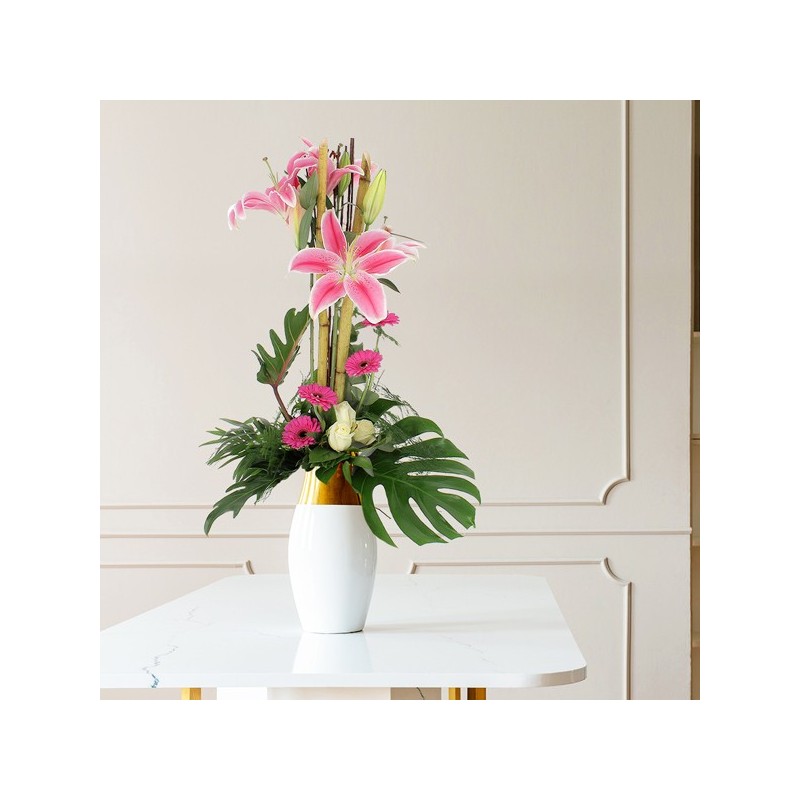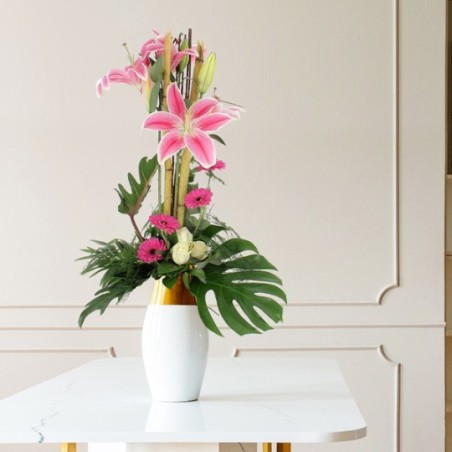 Bouquet longues tiges dans les tons rose, blanc et vert composé de roses, lys, gerberas et feuillages.