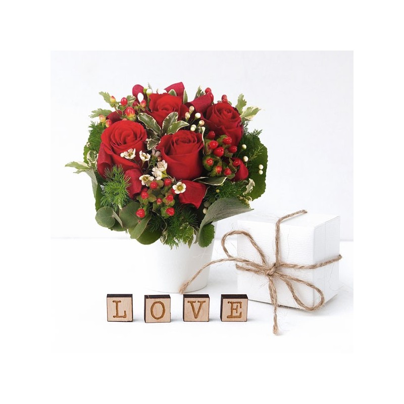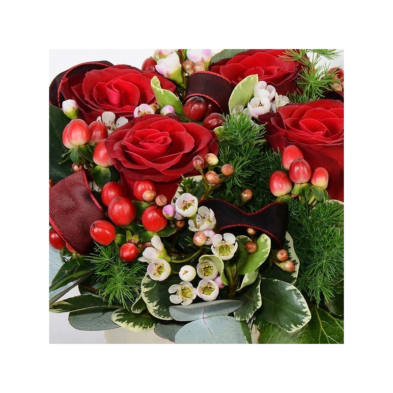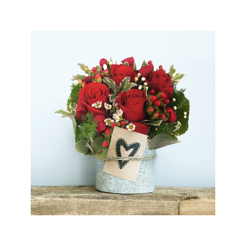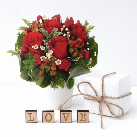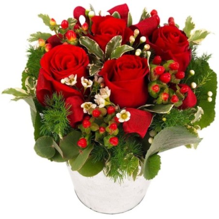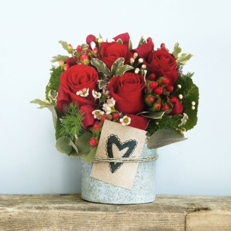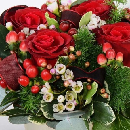 Composition piquée dans les tons rouges composée de roses, fleurettes et feuillage, le tout présenté dans son contenant. Le contenant peut varier en fonction de la disponibilité du fleuriste en charge de votre commande.