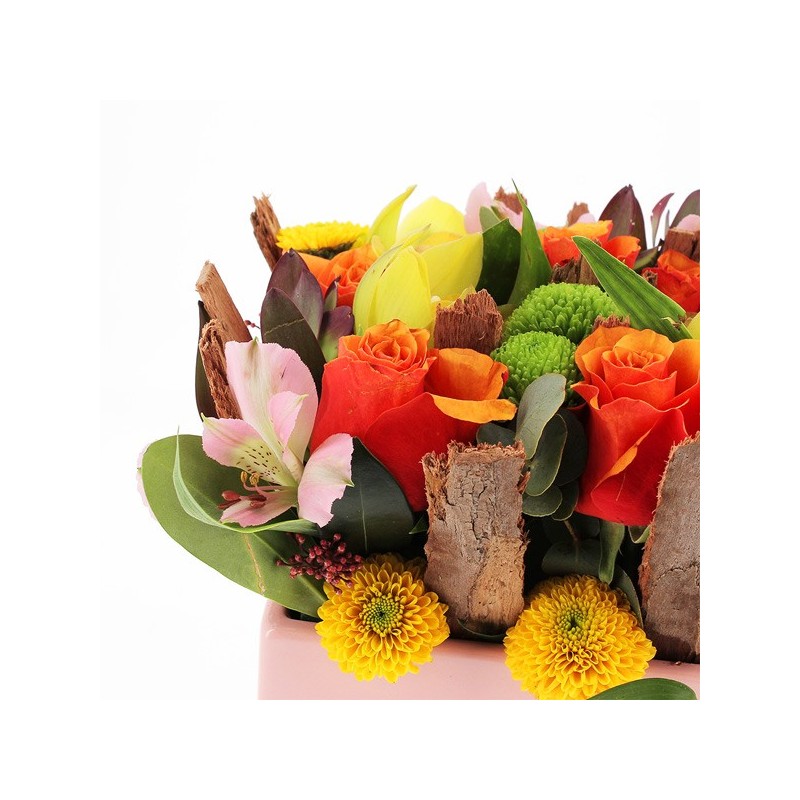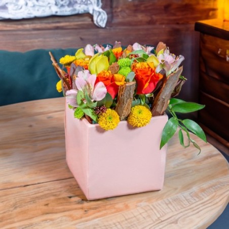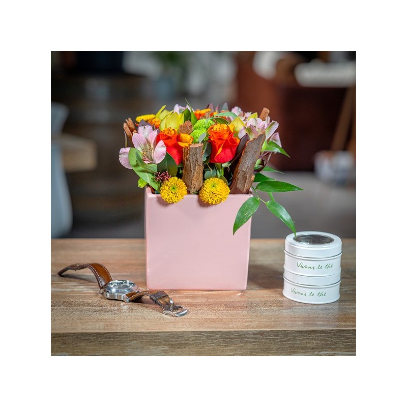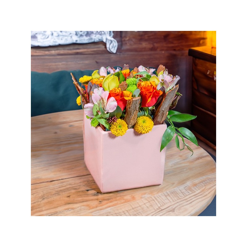 Composition piquée dans les tons orange, jaune, vert et rose composée de roses, alstromerias et autres fleurs de saison dans un contenant carré (le contenant peut varier en fonction des disponibilités).