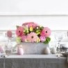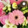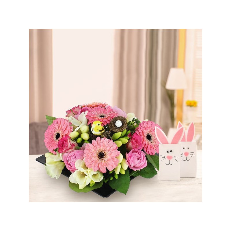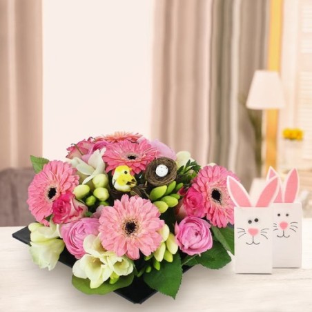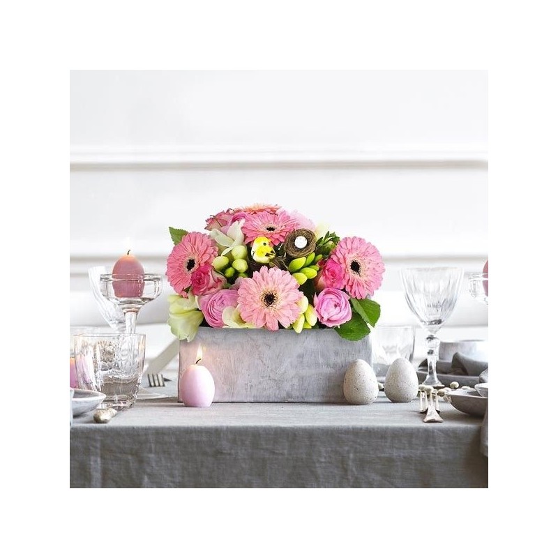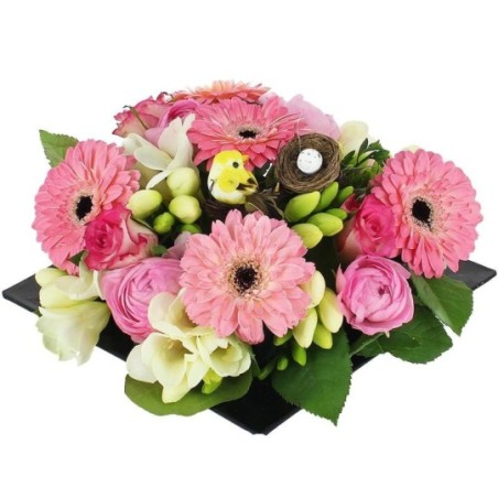 Composition piquée dans les tons rose et blanc (Spéciale Pâques) composée de renoncules, de germinis et d'autres fleurs de saison. Elle est accompagnée d'un un pic oiseau avec son nid d’œufs (la décoration peut varier) dans un contenant carré (le contenant peut varier en fonction des disponibilités).