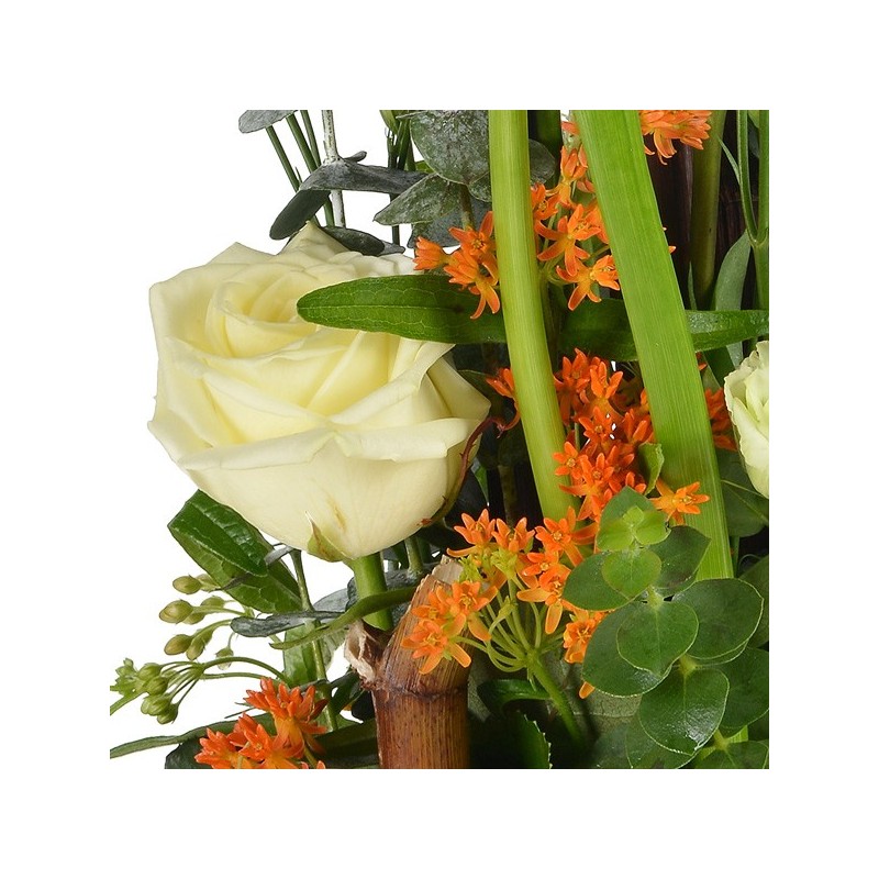 Composition moderne dans les tons orange et blanc, avec roses, arums ou callas, fleurettes de saison, branchages et feuillages, dans un contenant assorti.