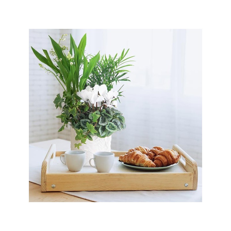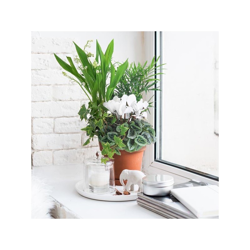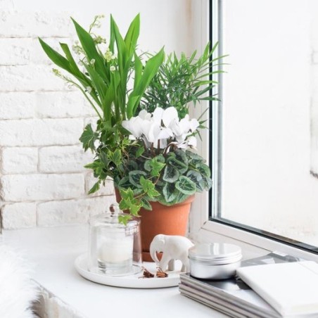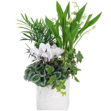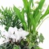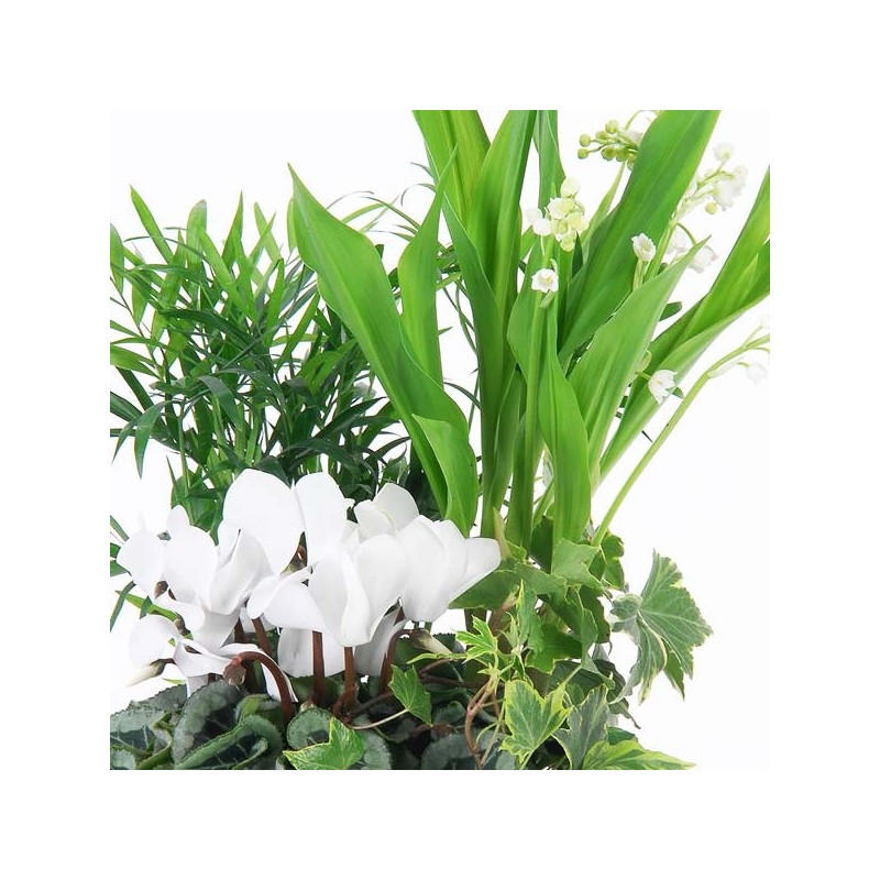 Composition dans les tons de blanc réalisée à partir de cyclamen (peut être remplacé en fonction des disponibilités chez le fleuriste), muguet en racines et autres petites plantes vertes.
