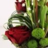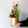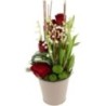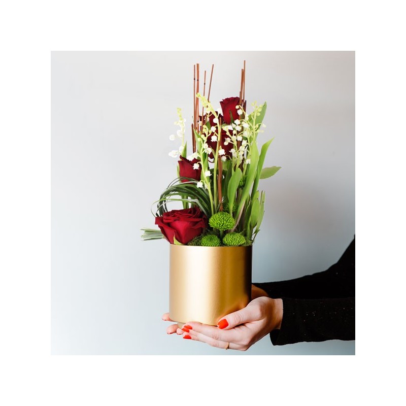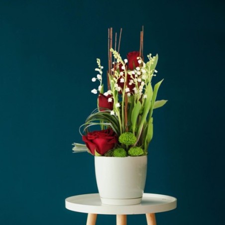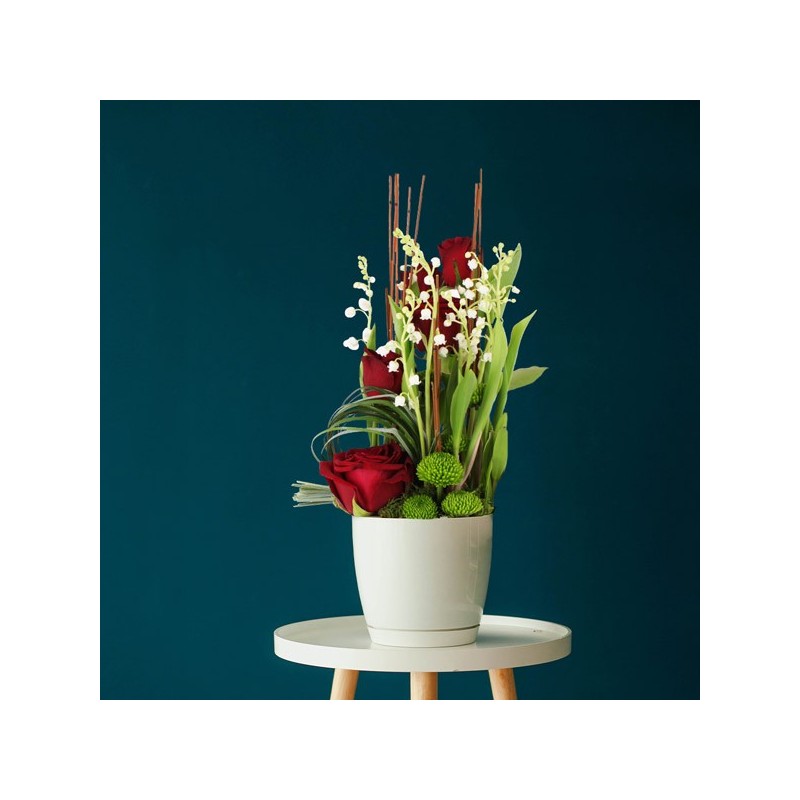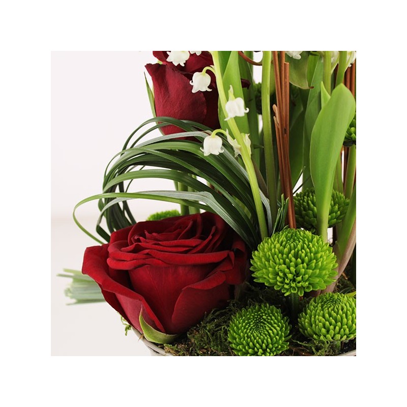 Composition florale dans les tons blanc et rouge composée de brins de muguet, roses rouge et autres fleurs de saison dans un contenant. le contenant varie en fonction des disponibilités de votre artisan fleuriste.
