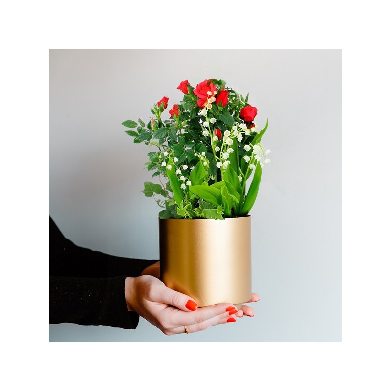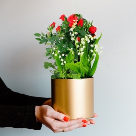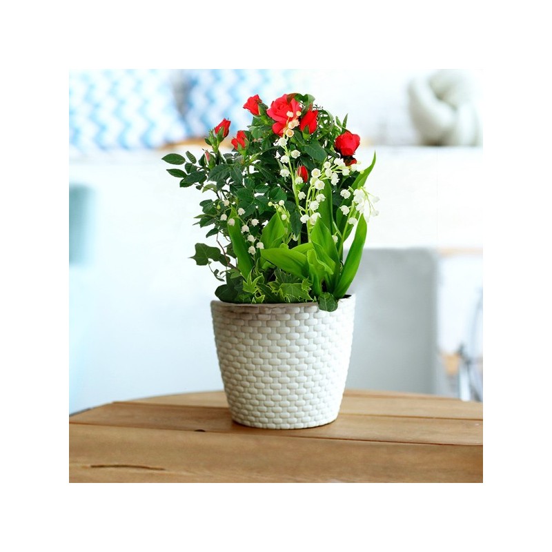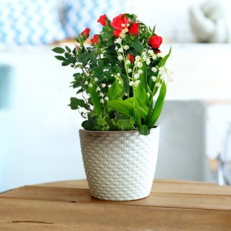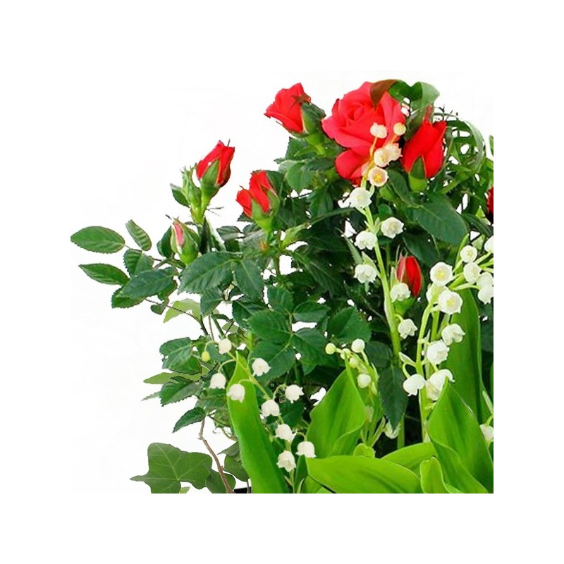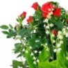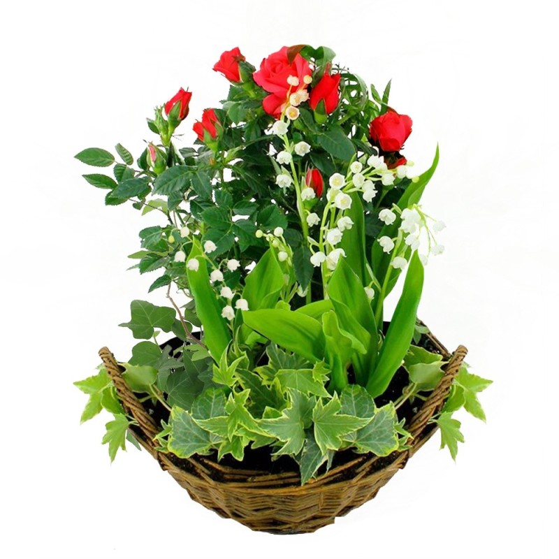 Coupe de plantes (spécial 1er mai) dans les tons vert, blanc et rouge composée d'un rosier rouge, de muguet et feuillage, le tout dans une corbeille en osier (le contenant peut varier en fonction des disponibilités chez le fleuriste en charge de votre commande).