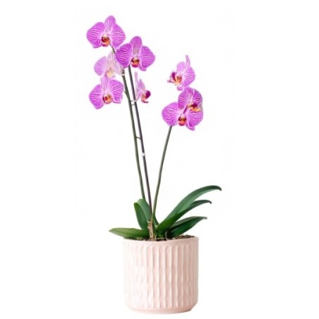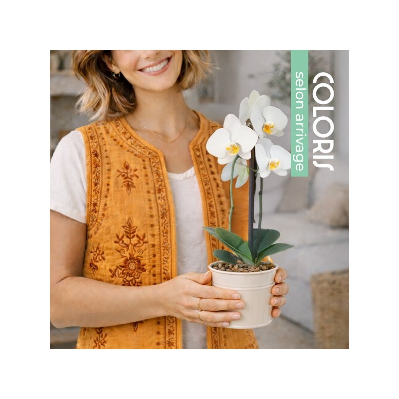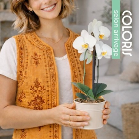 Orchidée en pot. Le contenant varie en fonction des disponibilités du fleuriste en charge de votre commande. Le coloris de l'orchidée varie selon l'arrivage.