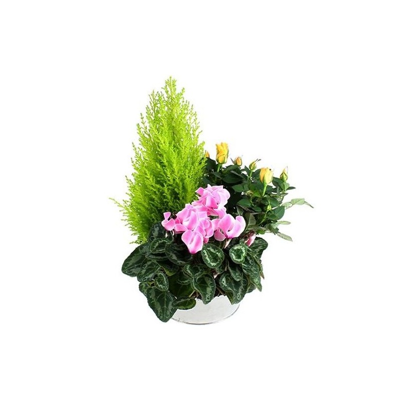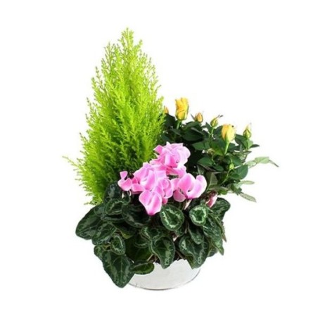 Composition de plantes d'extérieur dans les tons de jaune, rose et vert composée d'un cyprès et de plantes fleuries dans une coupe ronde en zinc (le contenant peut varier en fonction des disponibilités et les plantes en fonction des saisons).