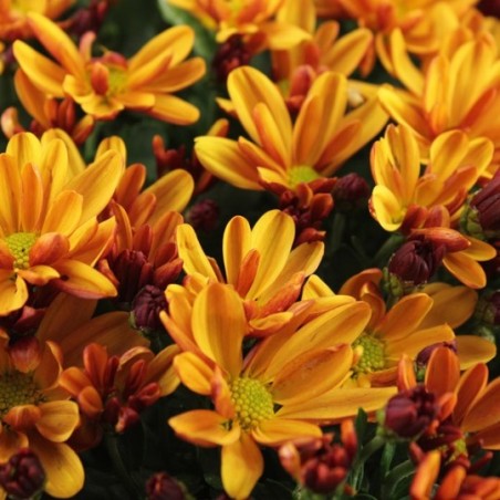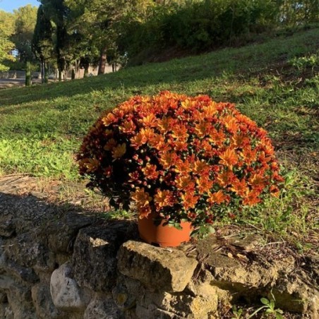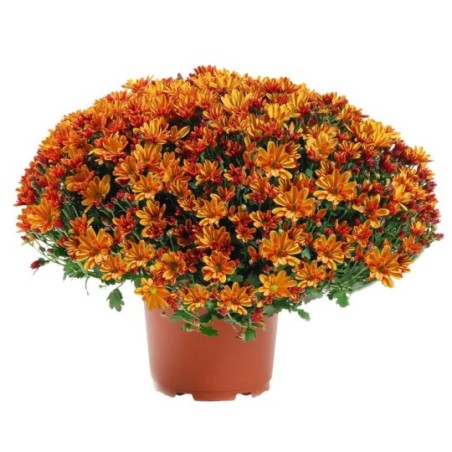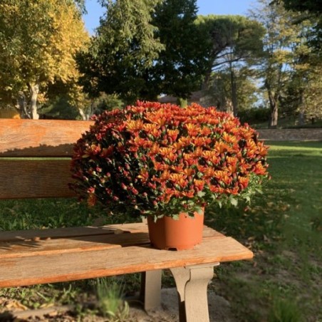 Potée de petits chrysanthèmes multifleurs oranges (petites fleurs, pomponnettes). Le contenant peut varier en fonction des disponibilités.