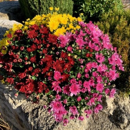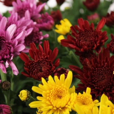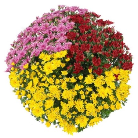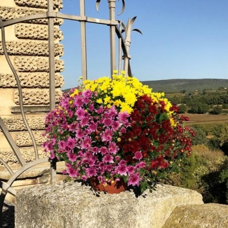 Potée de petits chrysanthèmes multicolores (petites fleurs, pomponnettes) .Le contenant peut varier en fonction des disponibilités.