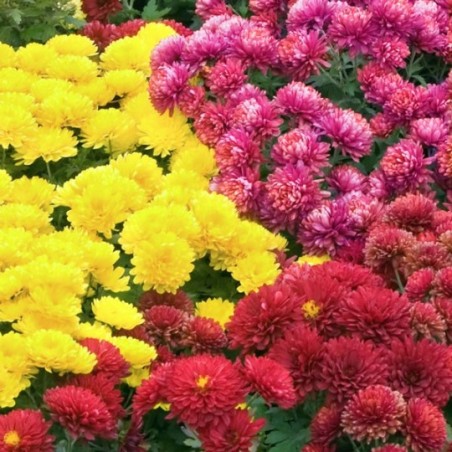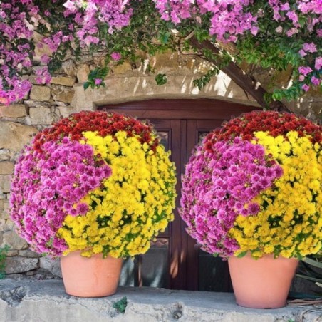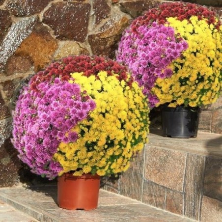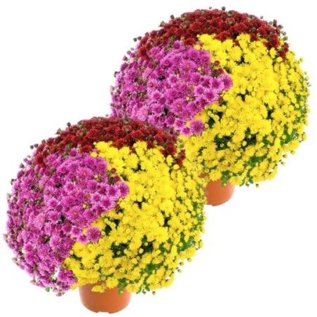 2 potées de petits chrysanthèmes multicolores (petites fleurs, pomponnettes). Le contenant peut varier en fonction des disponibilités.