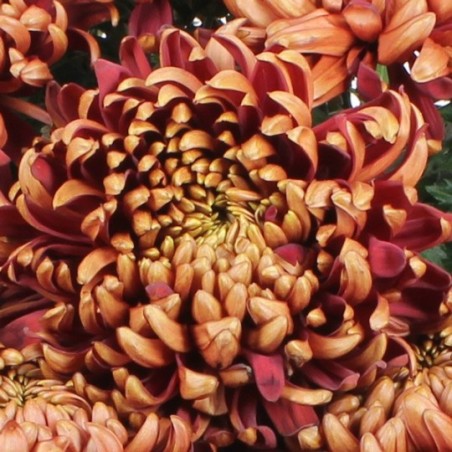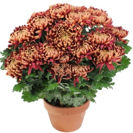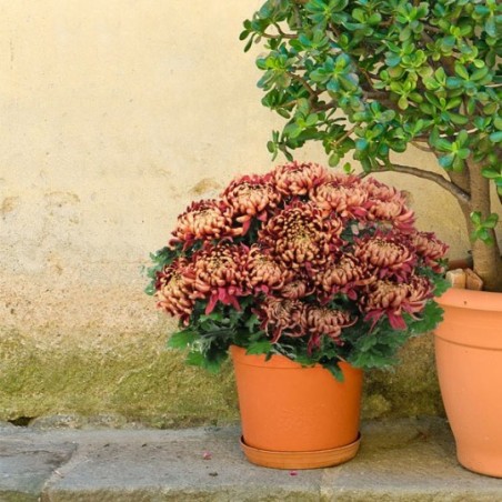 Potée de chrysanthèmes bordeaux à gros pompons (le contenant peut varier en fonction des disponibilités). Le nombre de pompons peut varier en fonction de la taille des fleurs disponibles chez le fleuriste en charge de votre commande.