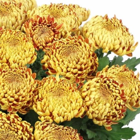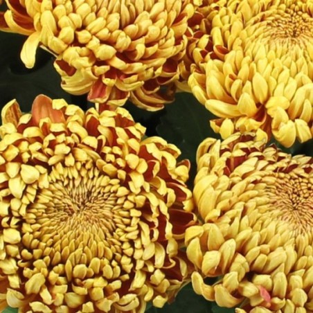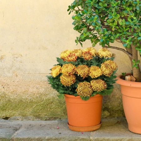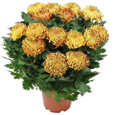 Potée de chrysanthèmes or à gros pompons (le contenant peut varier en fonction des disponibilités). Le nombre de pompons peut varier en fonction de la taille des fleurs disponibles chez le fleuriste en charge de votre commande.