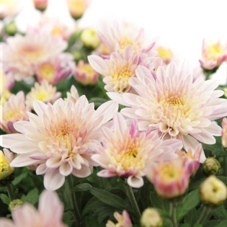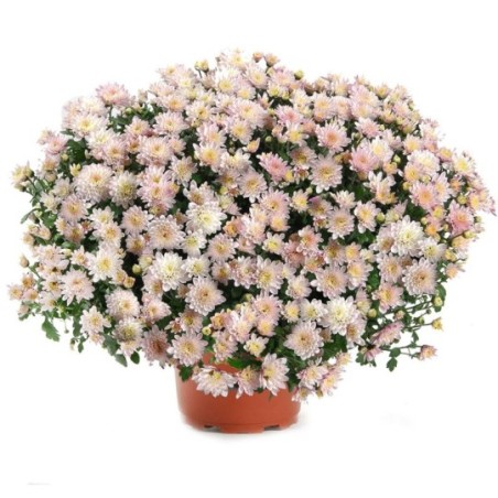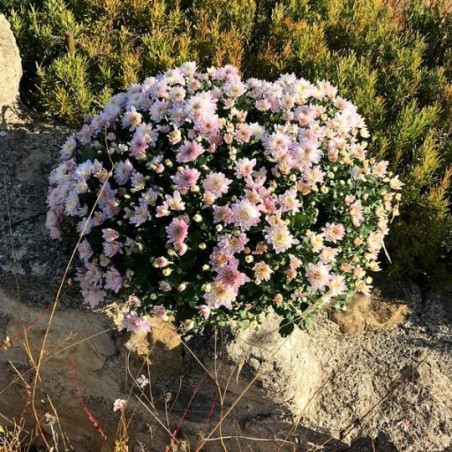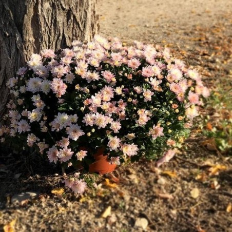 Potée de petits chrysanthèmes multifleurs roses (petites fleurs, pomponnettes). Le contenant peut varier en fonction des disponibilités.