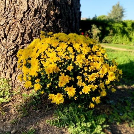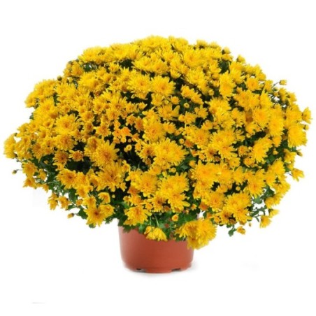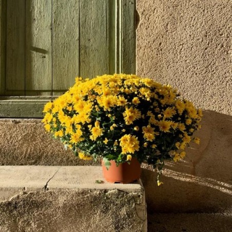 Potée de petits chrysanthèmes multifleurs jaunes (petites fleurs, pomponnettes) . Le contenant peut varier en fonction des disponibilités.