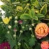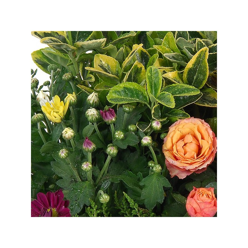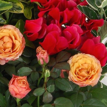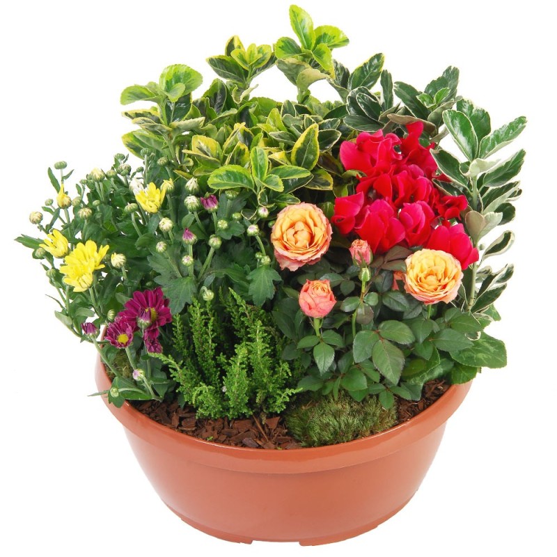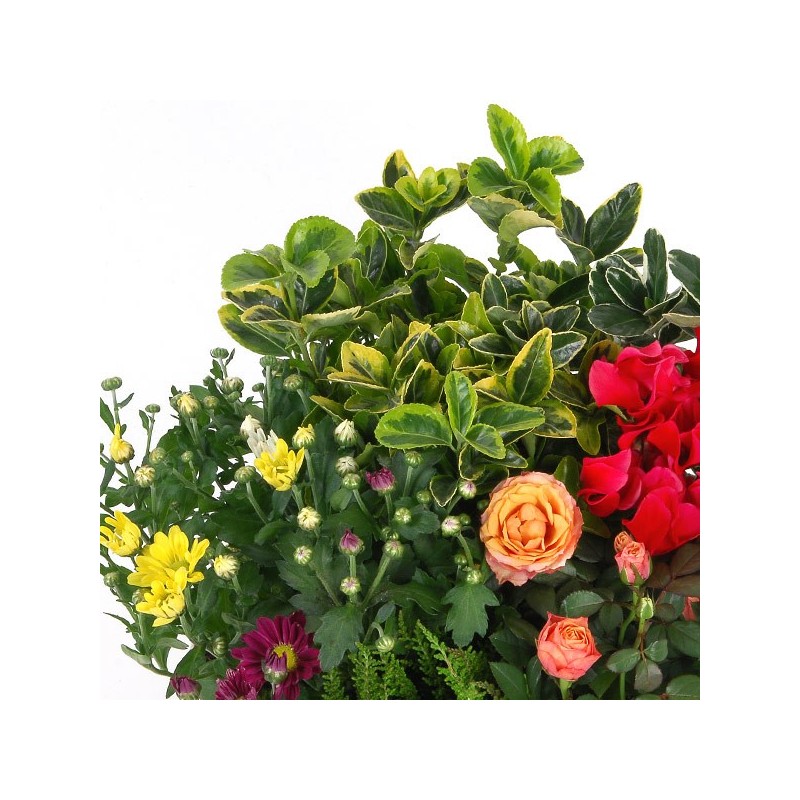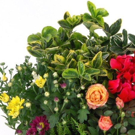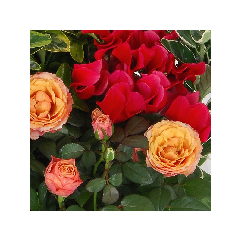Coupe de plantes dans les tons rouge, orange et vert composée de rosier, cyclamen et autre petites plantes le tout accompagné de son contenant. Le contenant peut varier en fonction de la disponibilité du fleuriste en charge de la commande.
