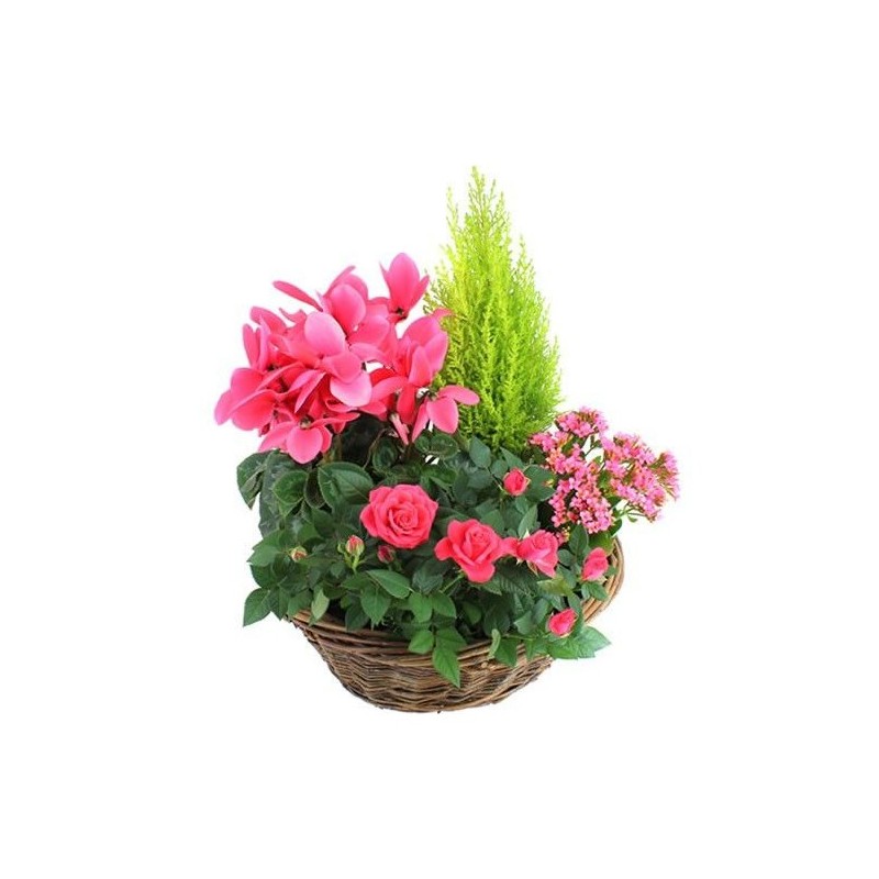 Composition de plantes d'extérieur dans les tons rose soutenu et vert composée d'un rosier, cyprès, kalanchoé et cyclamen dans un panier sans anse en osier (le contenant peut varier en fonction des disponibilités et les plantes en fonction des saisons).