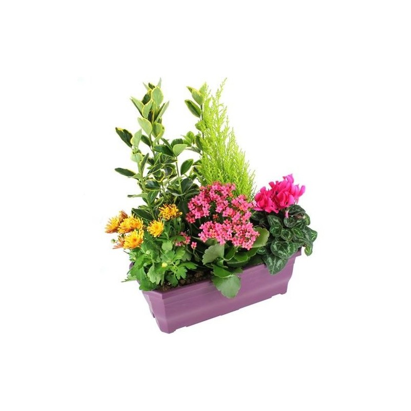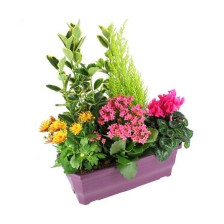 Composition de plantes d'extérieur dans les tons de jaune, rose et vert composée de chrysanthème,cyprès et de plantes vertes et fleuries dans une jardinière (le contenant peut varier en fonction des disponibilités et les plantes en fonction des saisons).