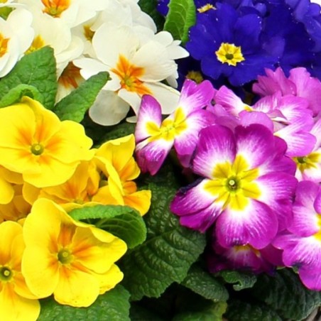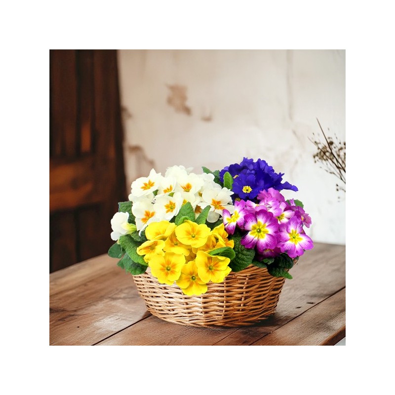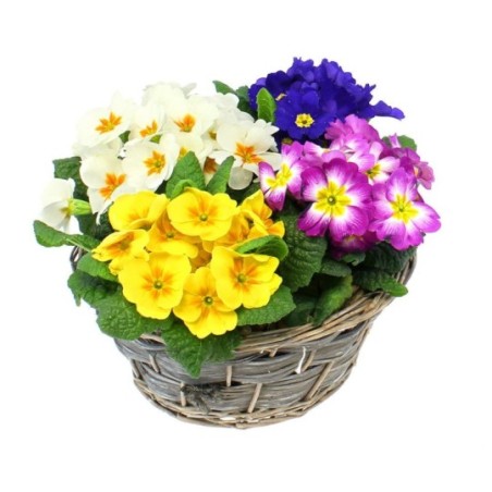 Coupe de primevères, aux coloris variés (le contenant et les couleurs des primevères peuvent varier en fonction des disponibilités du fleuriste en ...