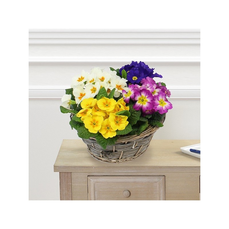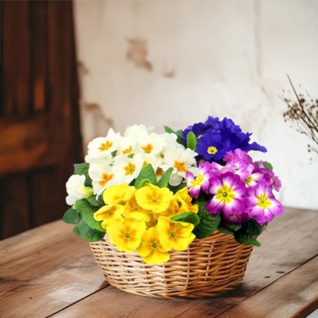 Coupe de primevères, aux coloris variés (le contenant et les couleurs des primevères peuvent varier en fonction des disponibilités du fleuriste en charge de votre commande).